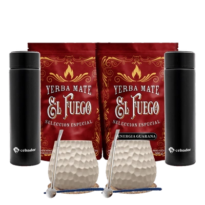 Mate-Tee-Set für zwei: El Fuego 2x500g + 2x Thermosflasche LED + 2x Kalebasse + 2x Bombilla