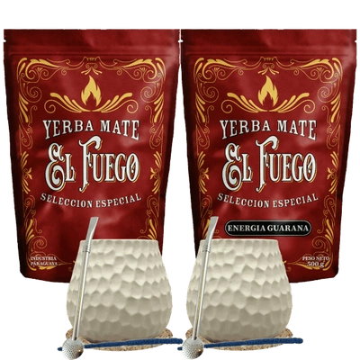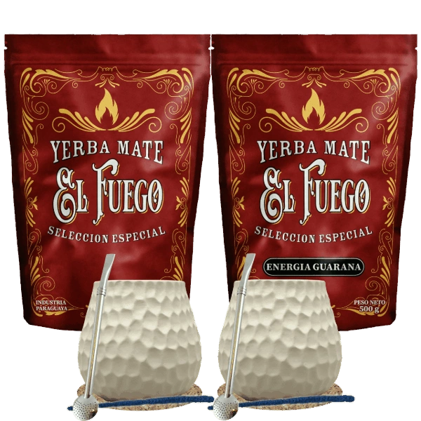 Starter-Set für zwei Personen Mate Tee El Fuego 2×500 g + 2× Kalebasse + 2× Bombilla