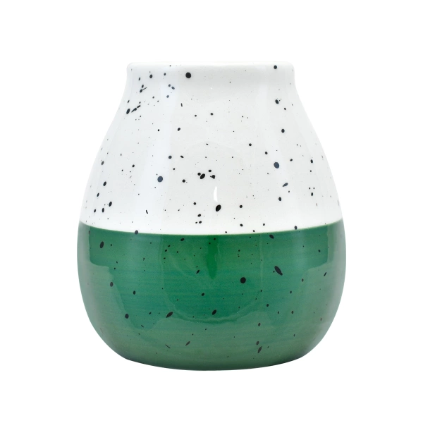 Keramischer Mate Becher Papagayo– ein bequemer, solide gefertigter Mate Becher mit einem Fassungsvermögen von etwa 300-350 ml. Die Form des Gefäßes ist von traditionellen südamerikanischen Kalebassen inspiriert. Innen und außen glasiert. Mit einer hellen Glasur überzogen und mit schwarzen, unregelmäßigen Punkten und Mustern verziert. Am Boden ist ein stilvoller Ausschnitt in Grün. Der Designer-Mate-Becher wird die Ausrüstung eines jeden Fans perfekt ergänzen!