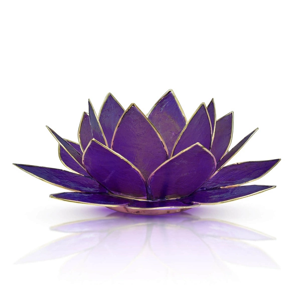 Tauche ein in den Zauber der Natur! Ungewöhnlicher, dunkelvioletter Kerzenständer Lotosblume, der aus zarten Capiz-Muscheln handgefertigt ist, wird jedes Interieur beleben. Das subtile Licht der Kerze, das durch die durchsichtigen Muscheln gefiltert wird, tanzt durch den Raum und schafft eine Aura von Frieden und Harmonie. Der Lotus, ein Symbol der Wiedergeburt und des spirituellen Weges, bringt einen Hauch von Mystik und Eleganz in dein Zuhause. Wenn du die Natur liebst und dich gerne mit schönen Objekten mit versteckter Symbolik umgibst, ist dieser Kerzenständer wie für dich gemacht! Er ist auch eine perfekte Geschenkidee für Liebhaber von Esoterik und Kunst.
