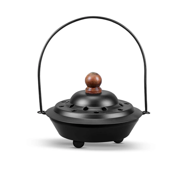 Räucherstäbchenhalter in Form eines Rauchfasses ist die ideale Wahl für Liebhaber orientalischer Atmosphären und schöner Düfte. Ein einfaches, aber elegantes Accessoire zum Verbrennen von Weihrauch, hergestellt aus einer hochwertigen Eisenlegierung im fernöstlichen Stil. Der Räucherstäbchenhalter ist mit einem Deckel und einem halbkreisförmigen Griff ausgestattet - ein Griff, der es leicht macht, das Räuchergefäß zu bewegen, zum Beispiel während eines Rituals des Räucherns mit weißem Salbei oder Palo Santo. Es kann für das Verbrennen verschiedener Arten von Räucherwerk verwendet werden: Kräuterbündel, Hölzer, Späne, Räucherstäbchen, Räucherkegel oder lose Räucherungen. Dank des intelligenten Designs bleibt die Asche im Inneren des Räuchergefäßes, ohne es zu verschmutzen. Die Untertasse dient nicht nur als Zubehör für das Verbrennen von Räucherwerk bei Ritualen, Meditation, Yoga oder einem entspannenden Bad, sondern auch als geschmackvolles Dekorationselement.