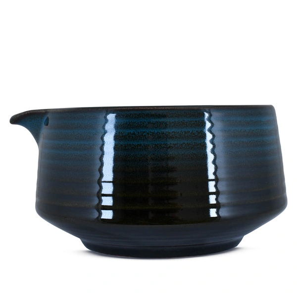Matchawan "Ame" (aus dem Japanischen "Regen") besticht durch ihre tiefe Farbe, die dunkelblaue und graue Nuancen kombiniert. Das Aussehen der Schale erinnert an Regentropfen, die auf Stein herunterlaufen - subtil und beruhigend, perfekt für ein friedliches Ritual in Gesellschaft von Matcha. Mit dem praktischen Ausgießer können Sie das Getränk einfach in ein anderes Gefäß oder eine Tasse umfüllen und behalten so die volle Kontrolle und Eleganz bei der Zubereitung.